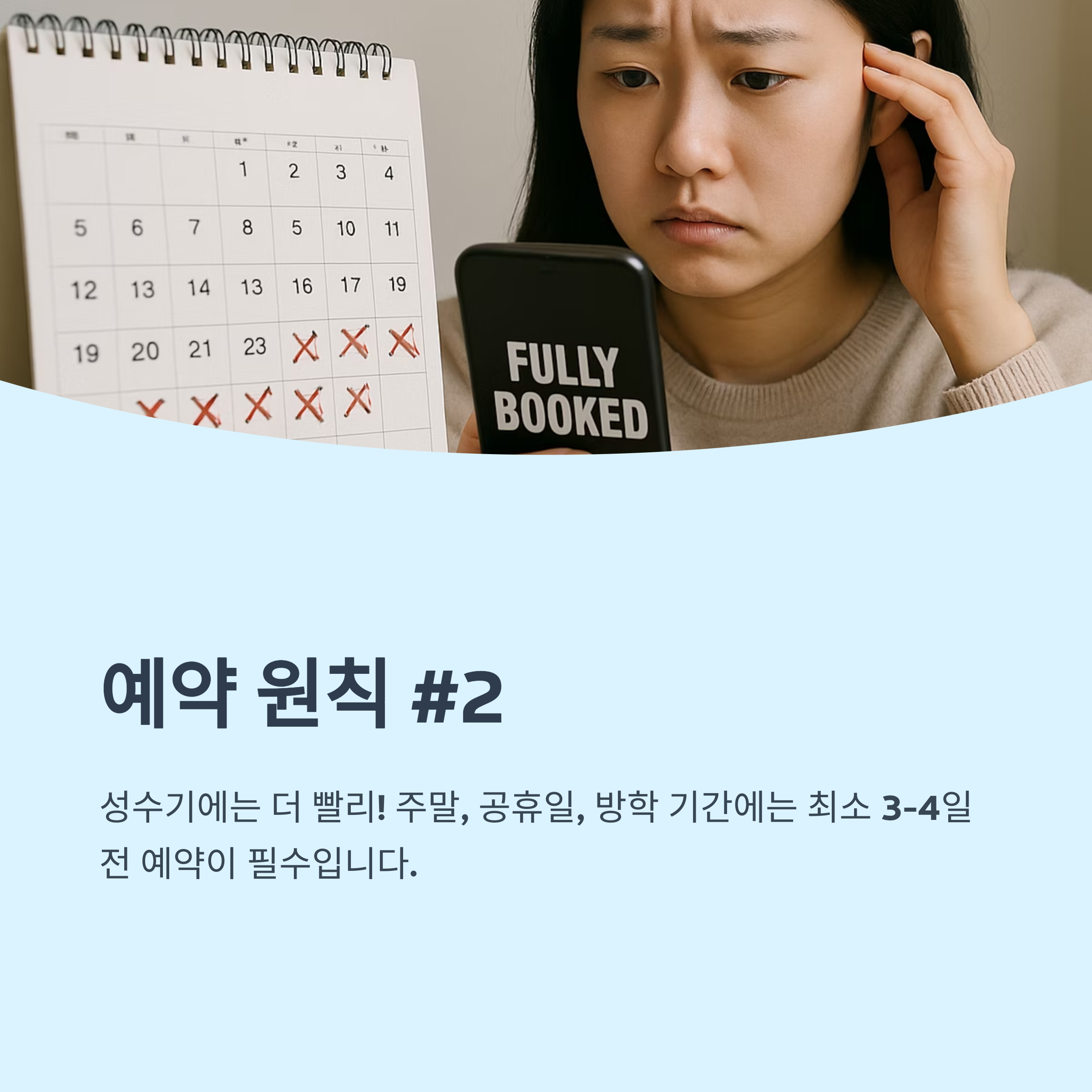주말, 공휴일, 학교 방학 기간에는 예약이 빠르게 마감됩니다. 최소 3-4일 전 예약하는 것을 추천해요!