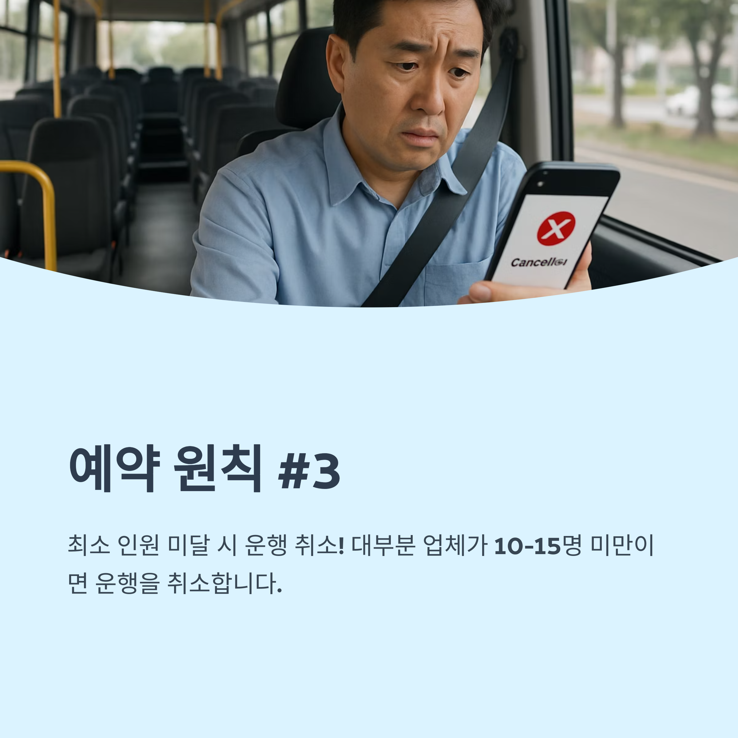 대부분 업체가 10-15명 미만이면 운행을 취소합니다. 전날 18:00 이후에 연락이 오니 참고하세요.