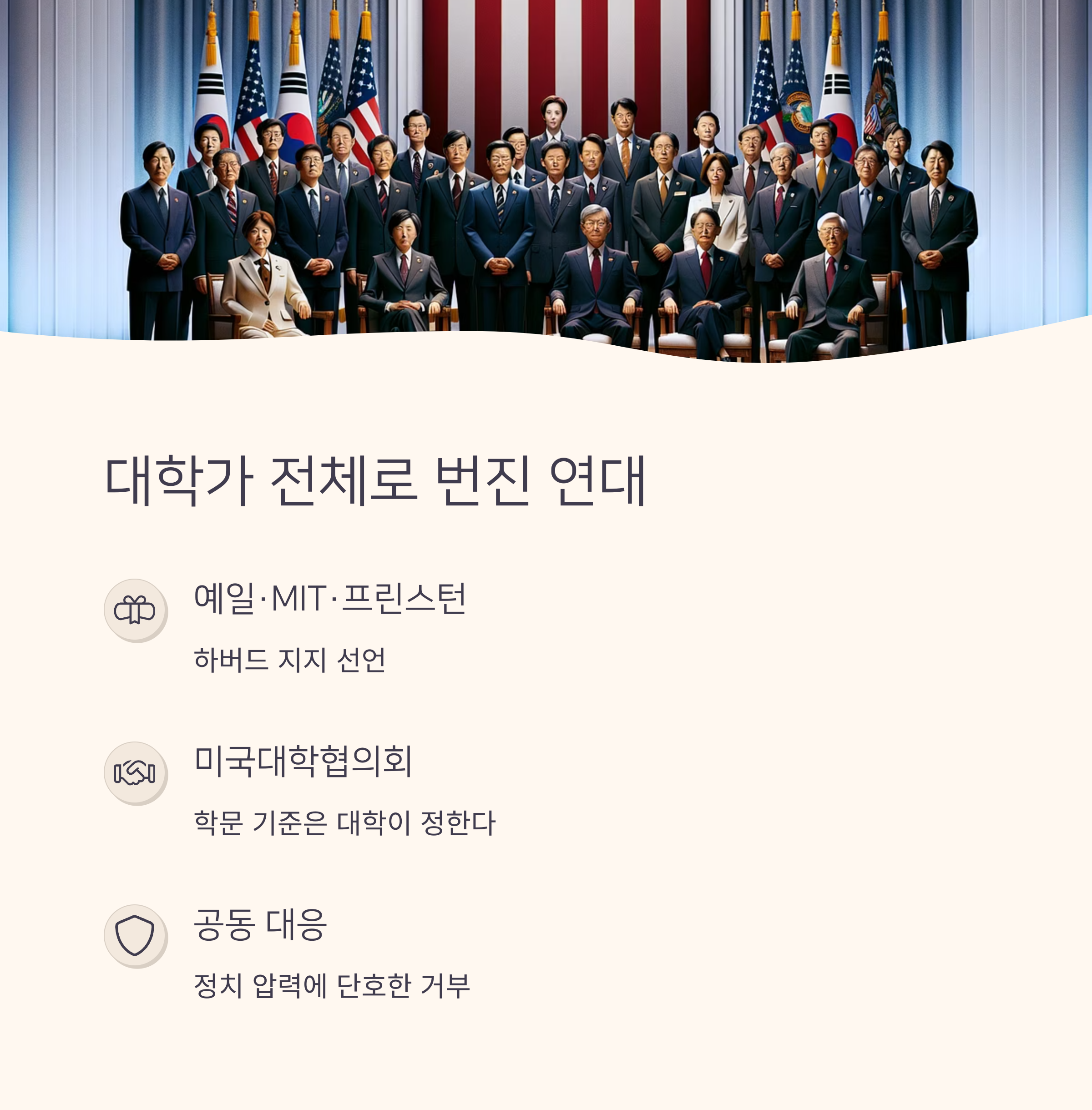 하버드의 단호한 입장 표명 이후, 다른 아이비리그 대학들과 주요 연구중심 대학들도 하나둘씩 유사한 입장을 밝히기 시작했습니다. 예일, 프린스턴, 스탠포드, MIT 등의 총장들은 공동 성명을 통해 "학문적 자유와 대학의 자율성은 타협할 수 없는 가치"라고 강조했습니다.