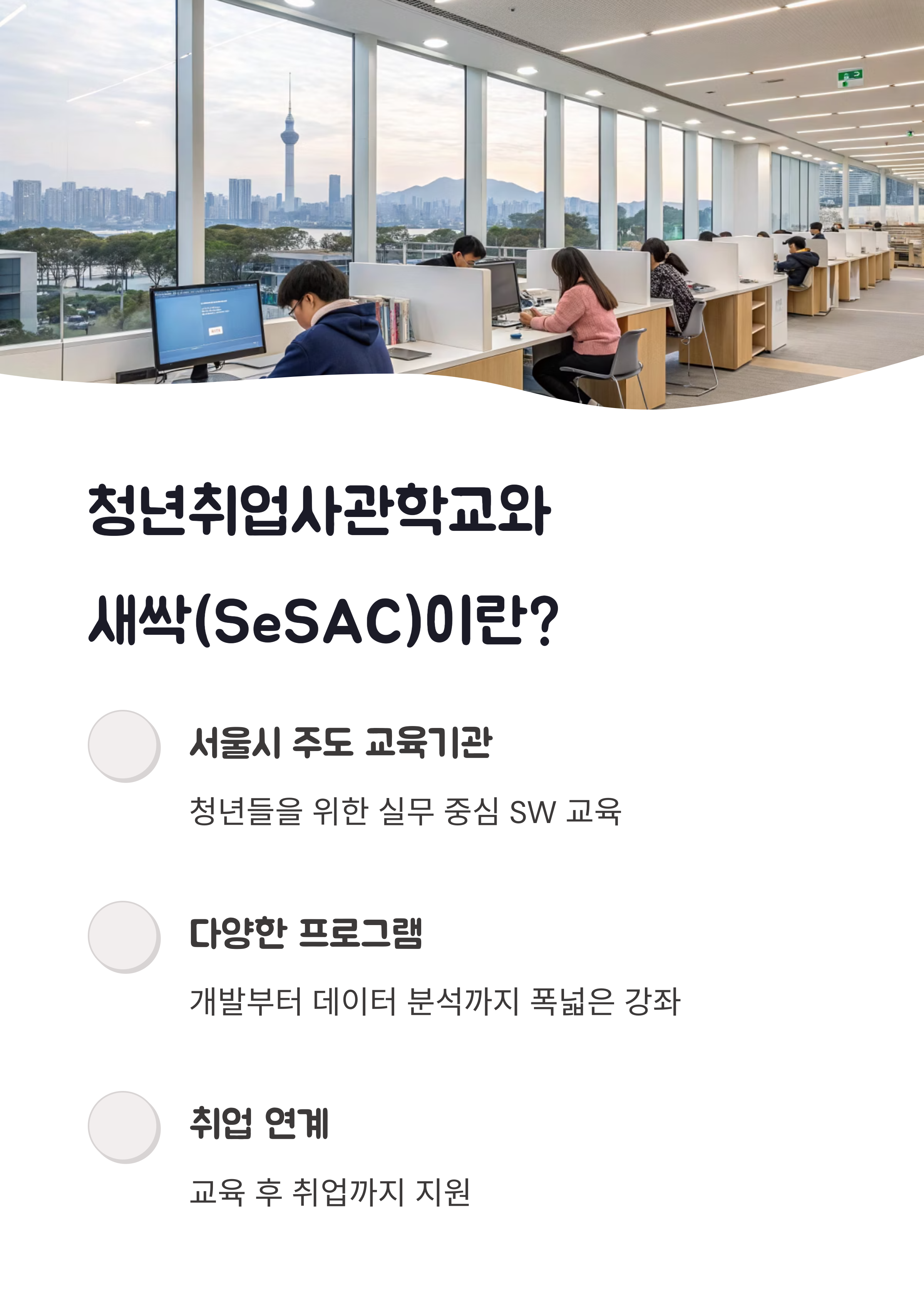 청년취업사관학교는 서울시에서 운영하는 청년 취업 지원 프로그램으로, 새싹(Seoul Software Academy, SeSAC)은 그 교육 브랜드명입니다. 이 프로그램은 청년들의 실질적인 취업 역량을 키우는 데 초점을 맞추고 있으며, 특히 SW 교육을 통해 디지털 인재를 양성하는 것을 목표로 합니다.