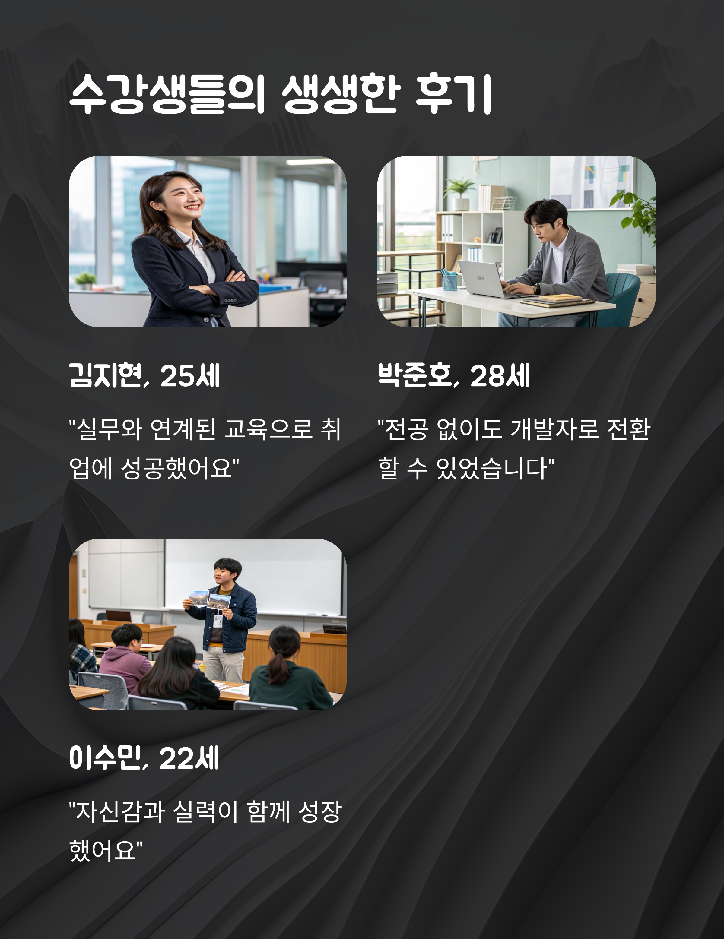 "직장인이라 시간이 부족했는데, 온라인으로 수강할 수 있어서 너무 좋았어요. 주말에는 오프라인 캠퍼스에서 실습도 하며 균형 있게 학습할 수 있었습니다." - 박OO님(31세)