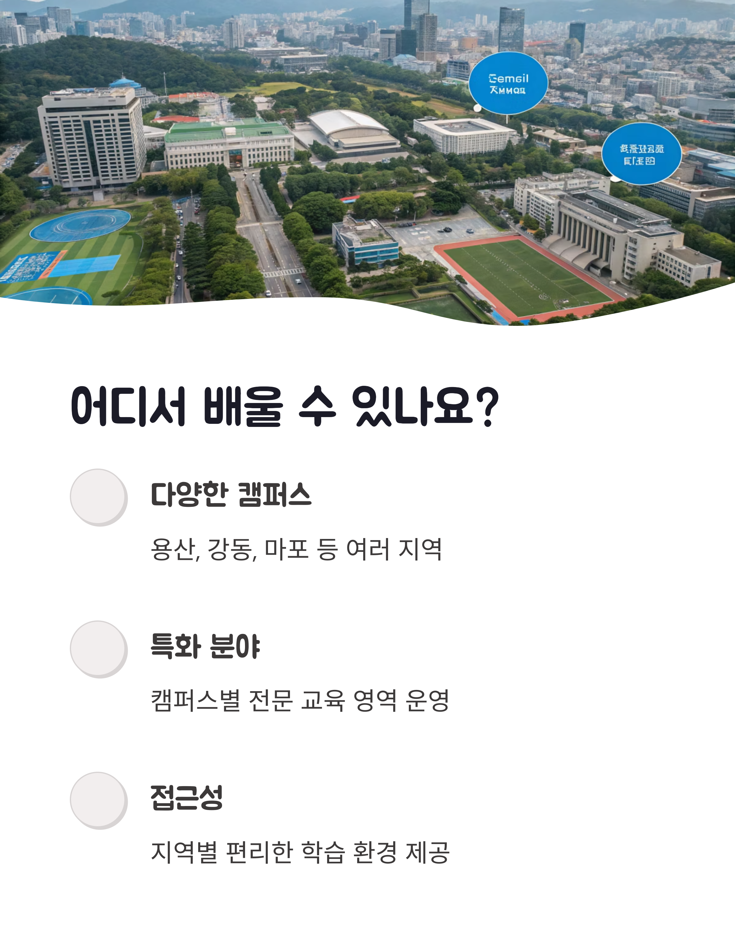 2025년 현재 서울시 전역에 총 7개의 캠퍼스가 운영되고 있으니, 가장 가까운 곳에서 수업을 들을 수 있답니다!