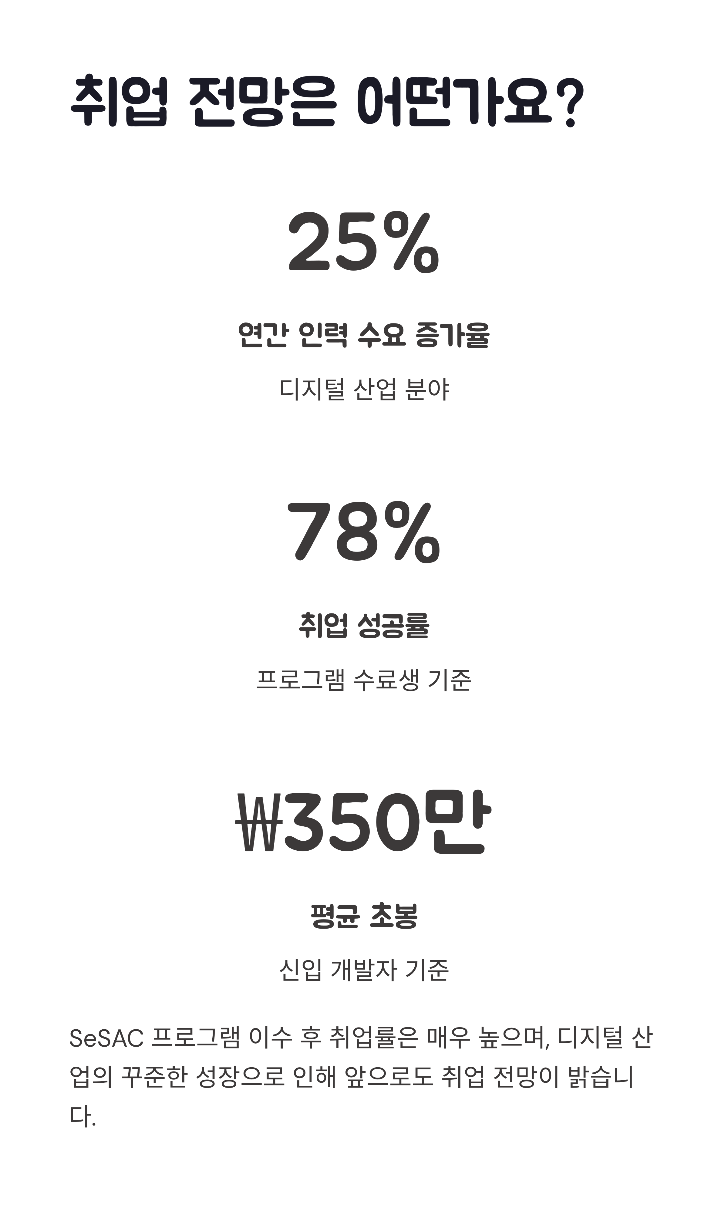 새싹 프로그램을 통해 SW 역량을 키운다면, 여러분의 취업 전망은 어떻게 달라질까요? 2025년 현재 디지털 인재에 대한 수요는 그 어느 때보다 높습니다!