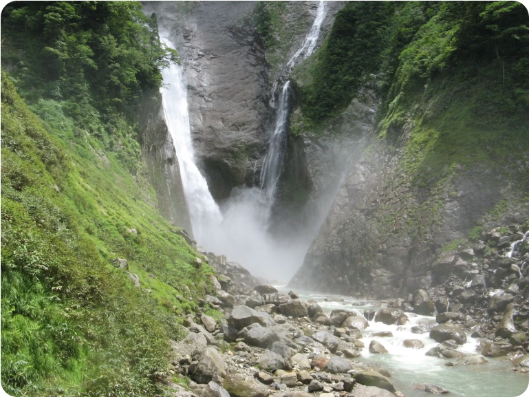 북알프스의 다테야마 쿠로베 알펜루트의 험준한 지형 속에 위치한 쇼묘 폭포는 일본에서 가장 높은 폭포 중 하나로, 자연의 웅장함을 상징합니다. 약 350미터의 놀라운 낙차를 가진 이 폭포는 압도적인 규모와 물줄기의 웅장한 소리로 방문객의 마음을 사로잡습니다.