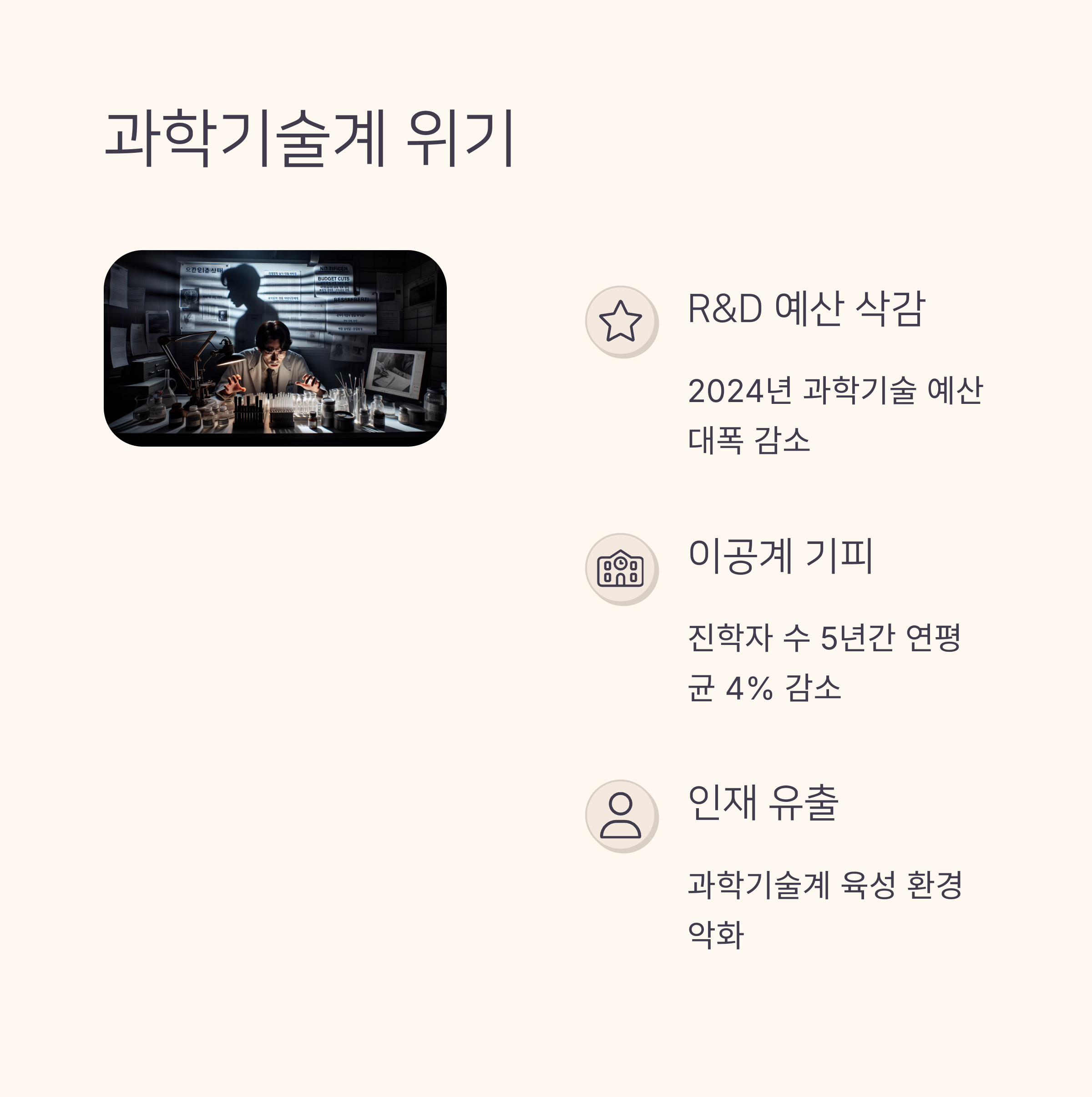과학기술 분야 역시 위기에 직면해 있습니다. 2023년 주요 R&D 예산이 전년 대비 큰 폭으로 감소했으며, 이는 AI, 바이오 등 첨단 기술 개발에 큰 차질을 빚고 있습니다.