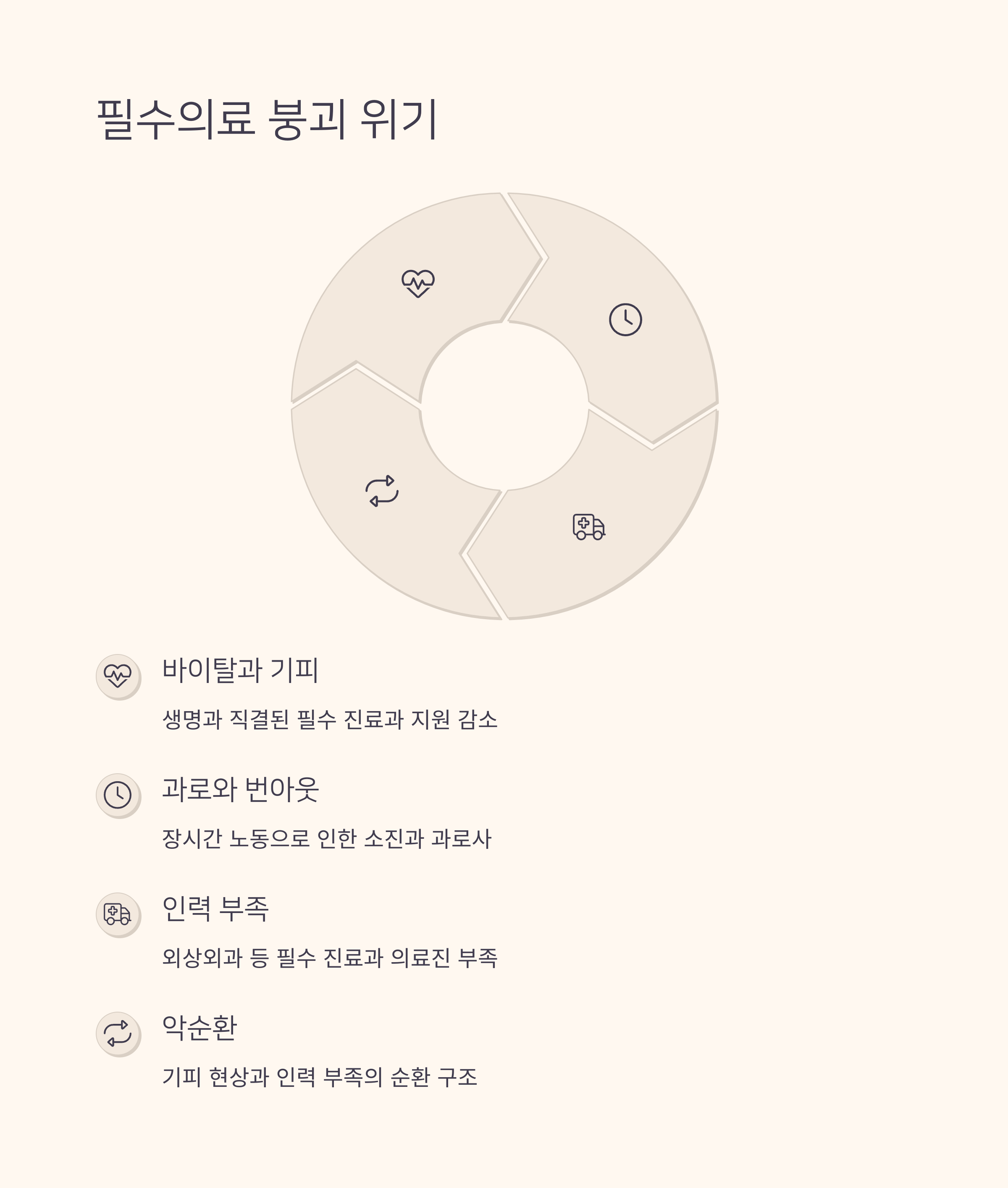 특히 필수의료 분야(외상, 응급, 산부인과, 소아과 등)의 인력 부족은 심각한 수준입니다. 2024년 기준 전체 전공의 중 필수의료 분야 지원률은 70% 미만으로, 매년 감소 추세를 보이고 있습니다.