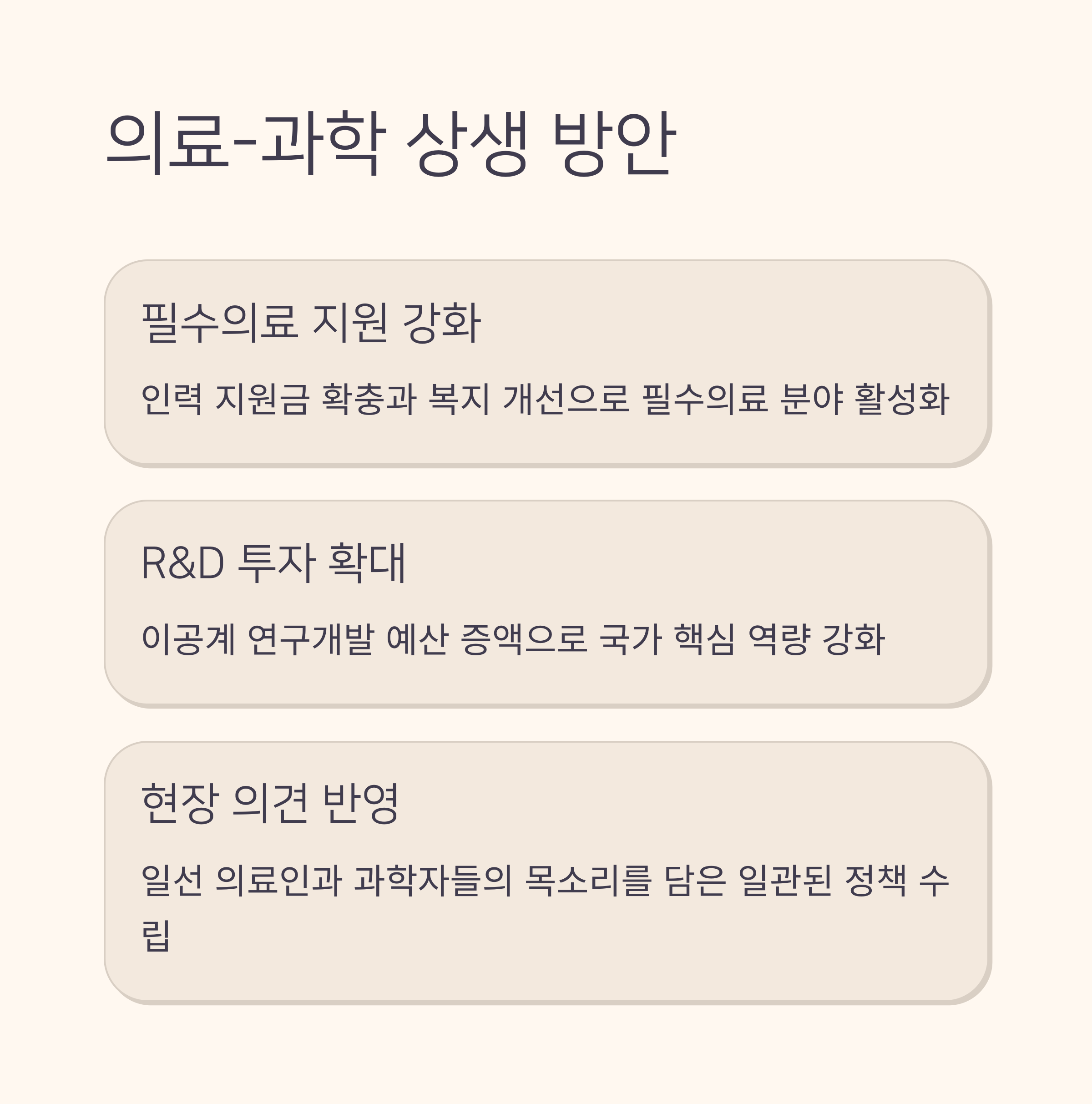 의료계와 과학기술계의 위기는 단기적인 처방으로 해결할 수 없는 구조적 문제입니다. 이를 해결하기 위해서는 현장의 목소리에 귀 기울이고, 데이터에 기반한 정책을 수립하며, 장기적 비전을 가지고 일관성 있게 추진해 나가는 리더십이 필요합니다.