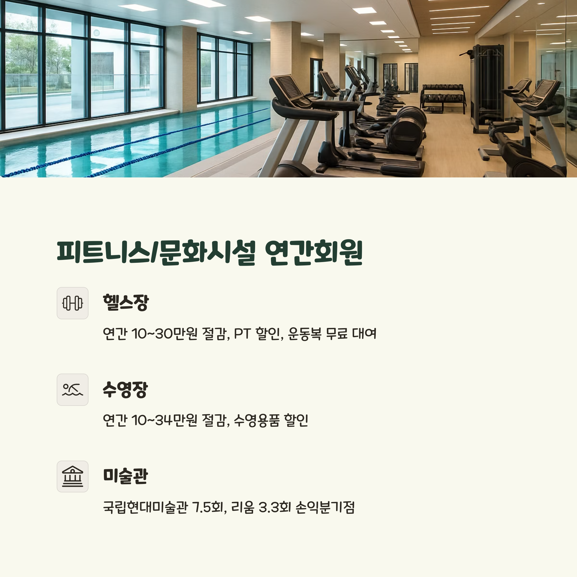 | 수영장 | 8~12만원/월 | 70~110만원/년 | 약 10~34만원 | 수영용품 할인, 프로그램 우선 등록 |