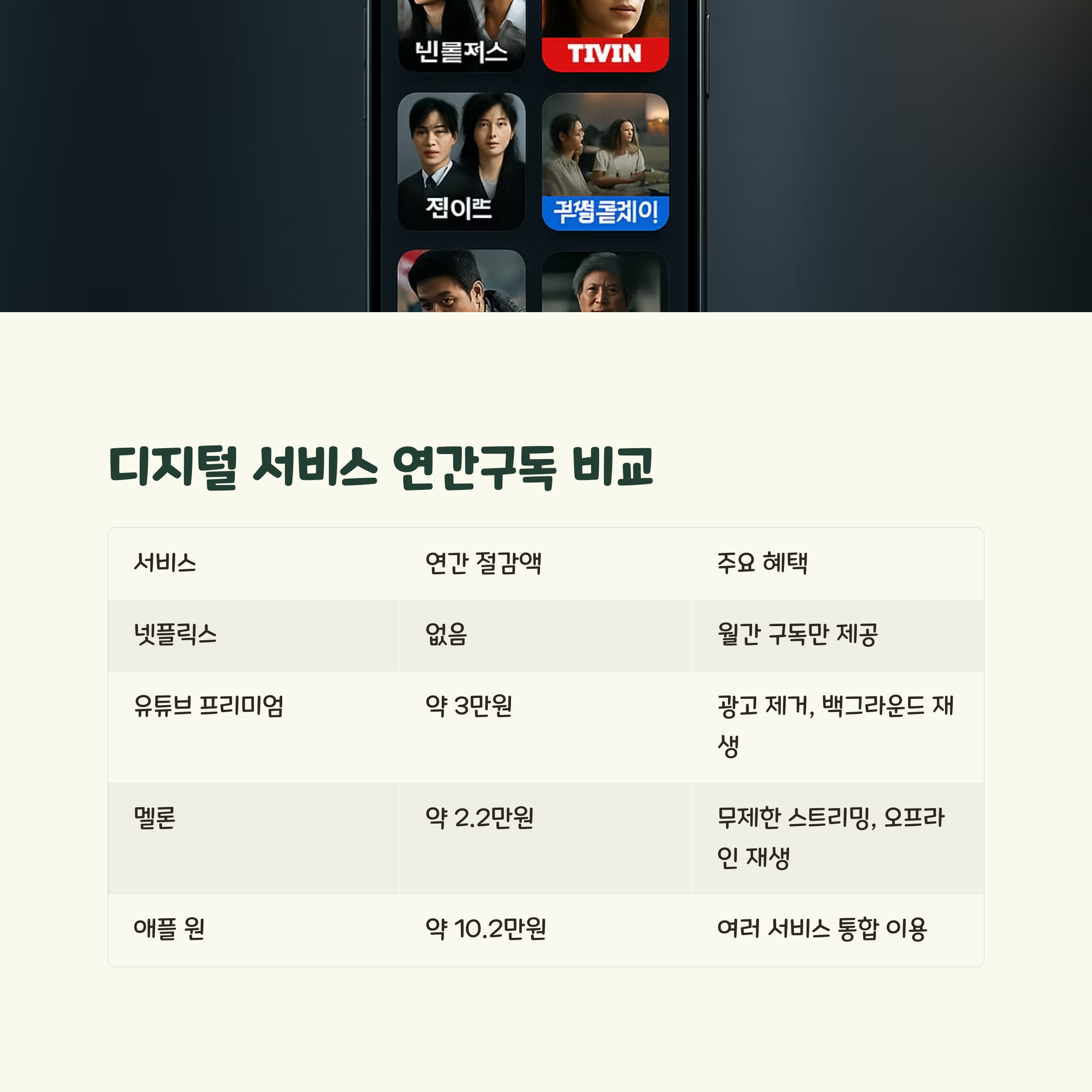 서비스 월 구독 연간 구독 연간 절감액 주요 혜택