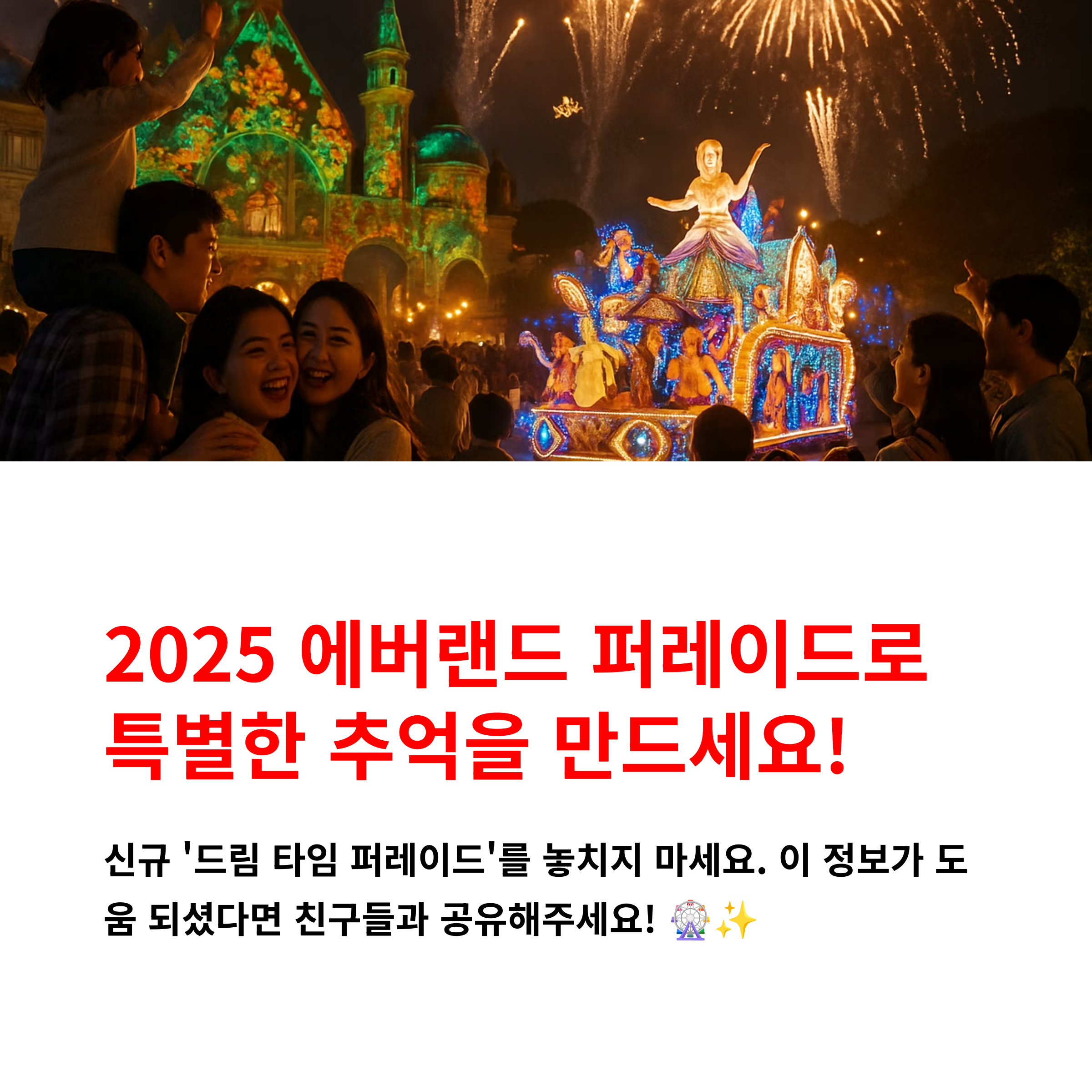 2025년 5월, 에버랜드의 환상적인 퍼레이드와 함께 잊지 못할 추억을 만들어보세요! 특히 올해 신규 도입된 '드림 타임 퍼레이드'는 꼭 놓치지 마시길 바랍니다. 방문 계획에 도움이 되셨기를 바라며, 더 많은 테마파크 소식은 이 블로그에서 계속 업데이트하겠습니다. 🎡✨