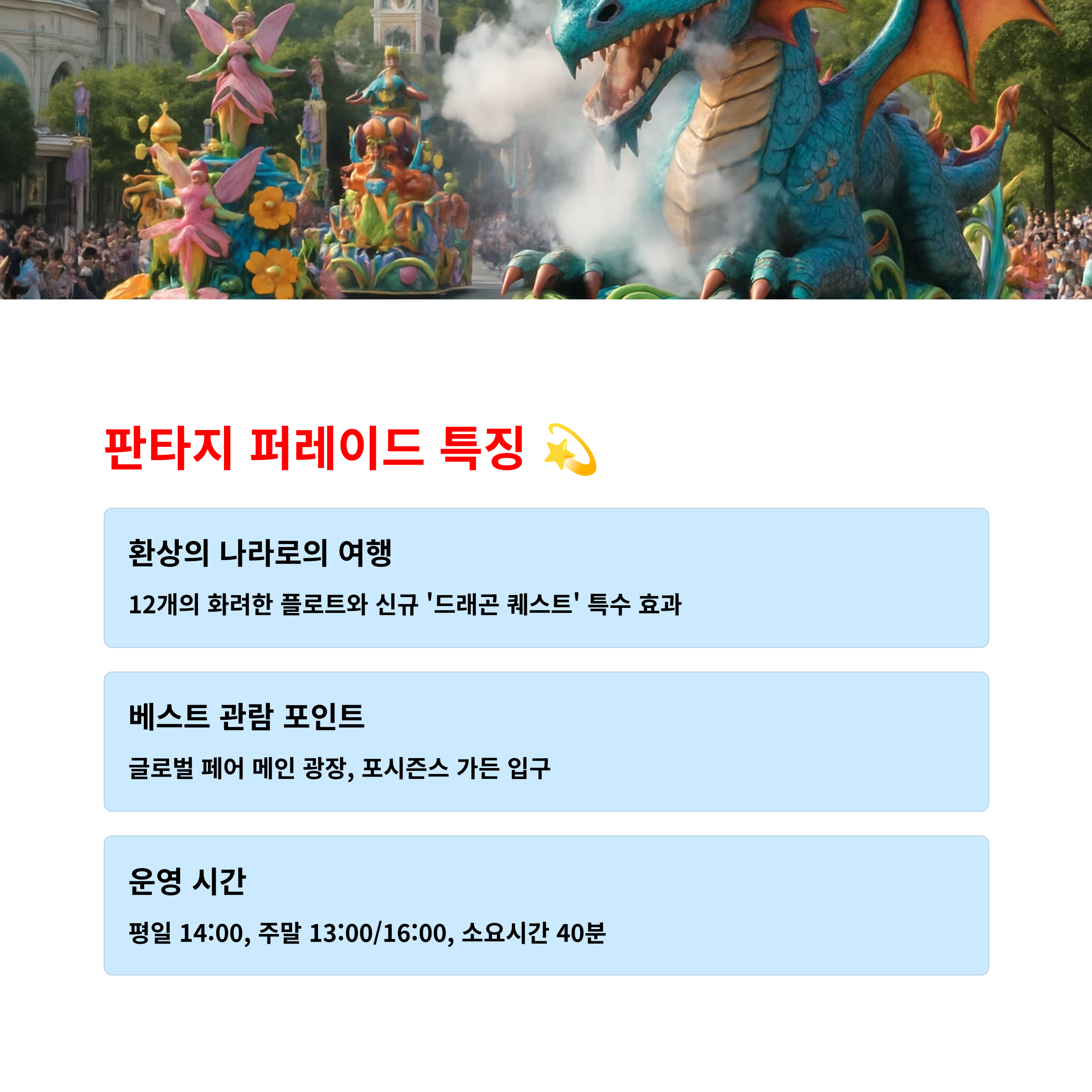 | 판타지 퍼레이드 | 14:00 | 13:00, 16:00 | 글로벌 페어→아메리칸 어드벤처 | 약 40분 |