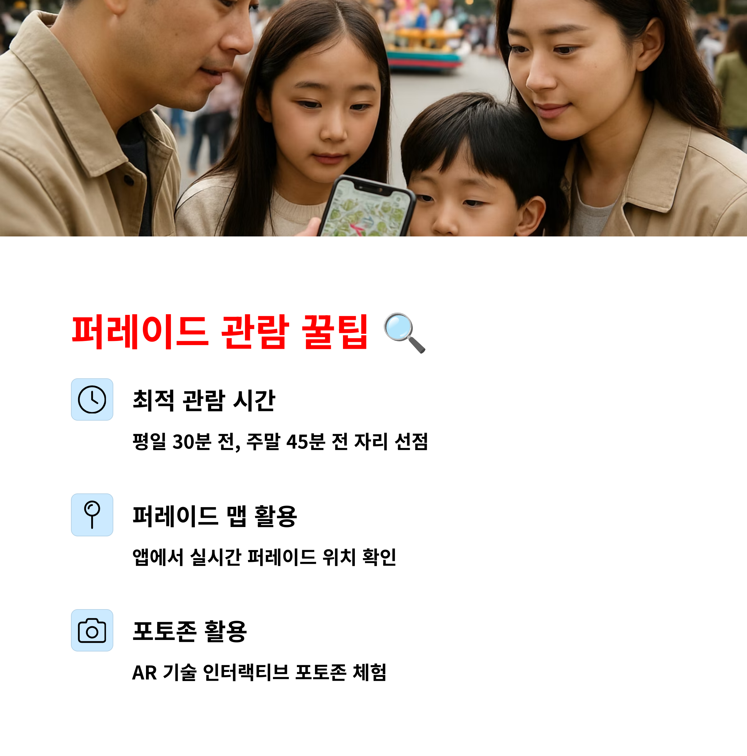 에버랜드 앱에서 제공하는 '퍼레이드 맵'을 활용하면 실시간으로 퍼레이드 위치를 확인할 수 있어 편리합니다. 또한 퍼레이드 경로를 미리 파악해두면 이동 계획을 세우는 데 도움이 됩니다.