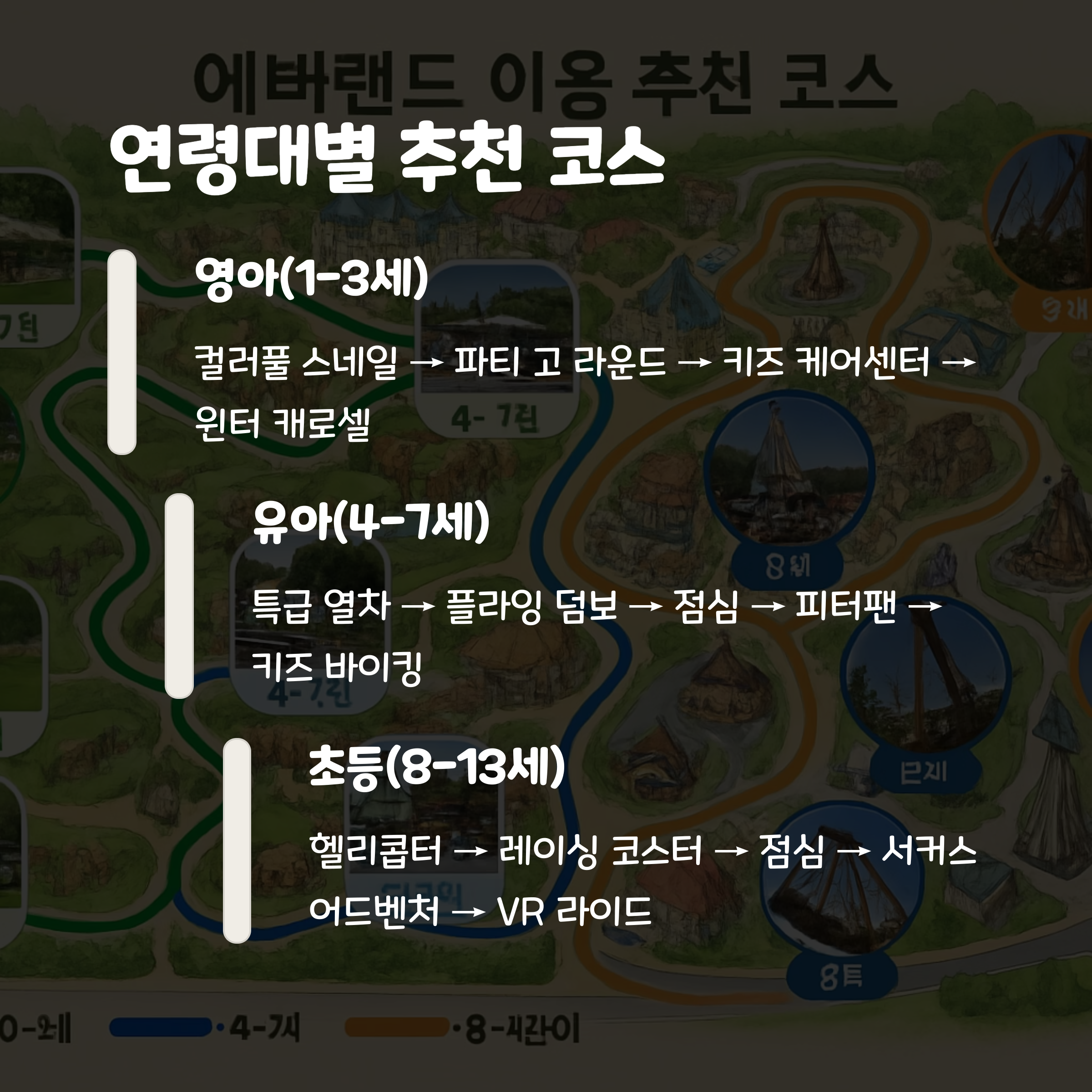 | 8-10세 | 레이싱 코스터, 헬리콥터, 헌티드 하우스 | 적당한 스릴감과 체험 | 키 120cm 미만 보호자 동반 |