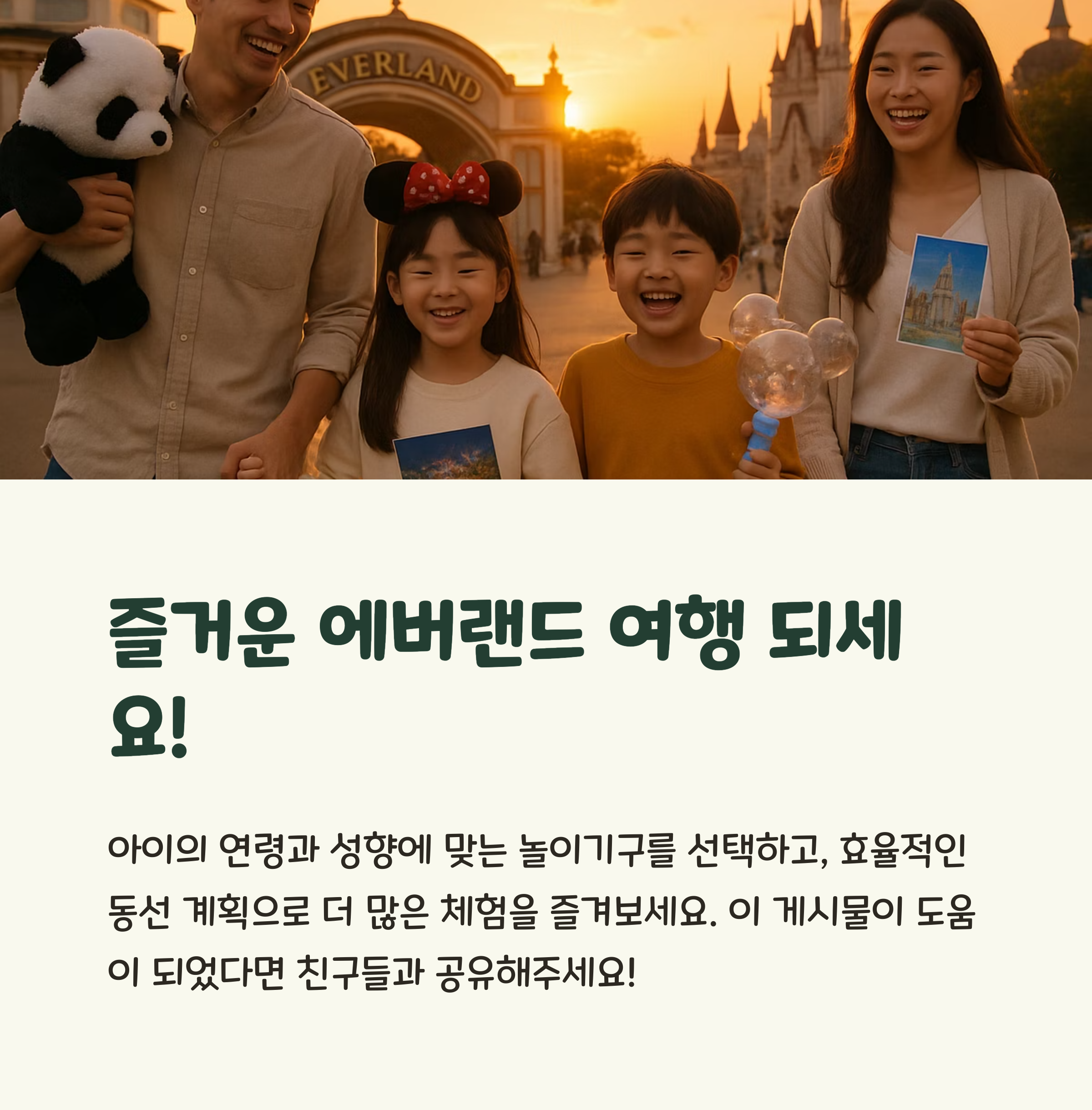 에버랜드에서 아이들과 함께 체험형 놀이기구를 즐기는 건 잊지 못할 추억이 될 거예요! 아이의 연령과 성향에 맞는 놀이기구를 선택하고, 효율적인 동선 계획으로 더 많은 체험을 즐겨보세요. 가족 모두가 함께 즐길 수 있는 행복한 에버랜드 여행이 되길 바랍니다! 🎈🎠