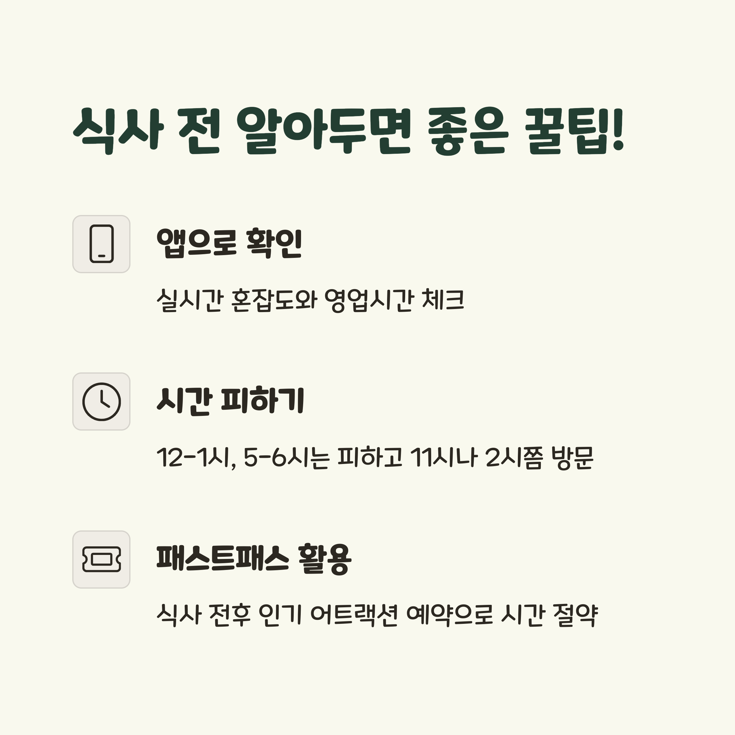 - 시간대별 계획하기 - 피크타임을 피해 한적한 시간에 식사하기