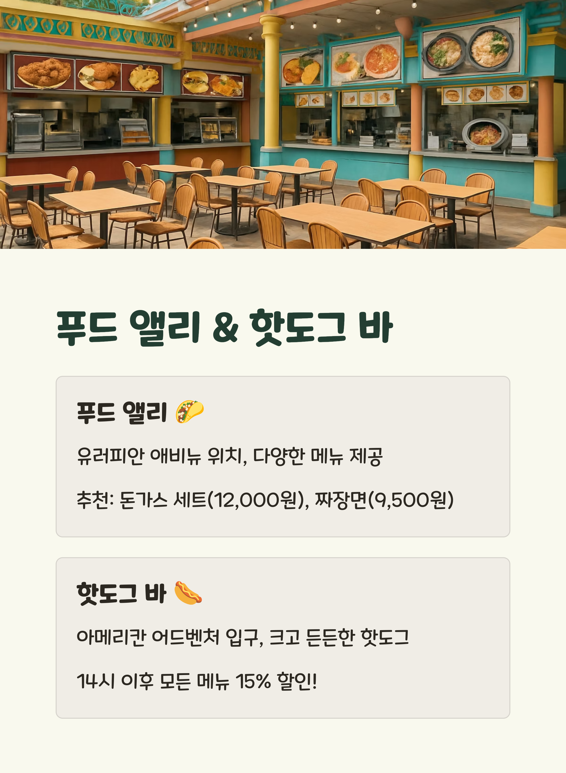 | 푸드 앨리 | 12,000원 | ⭐⭐⭐⭐⭐ | 유러피안 애비뉴 |