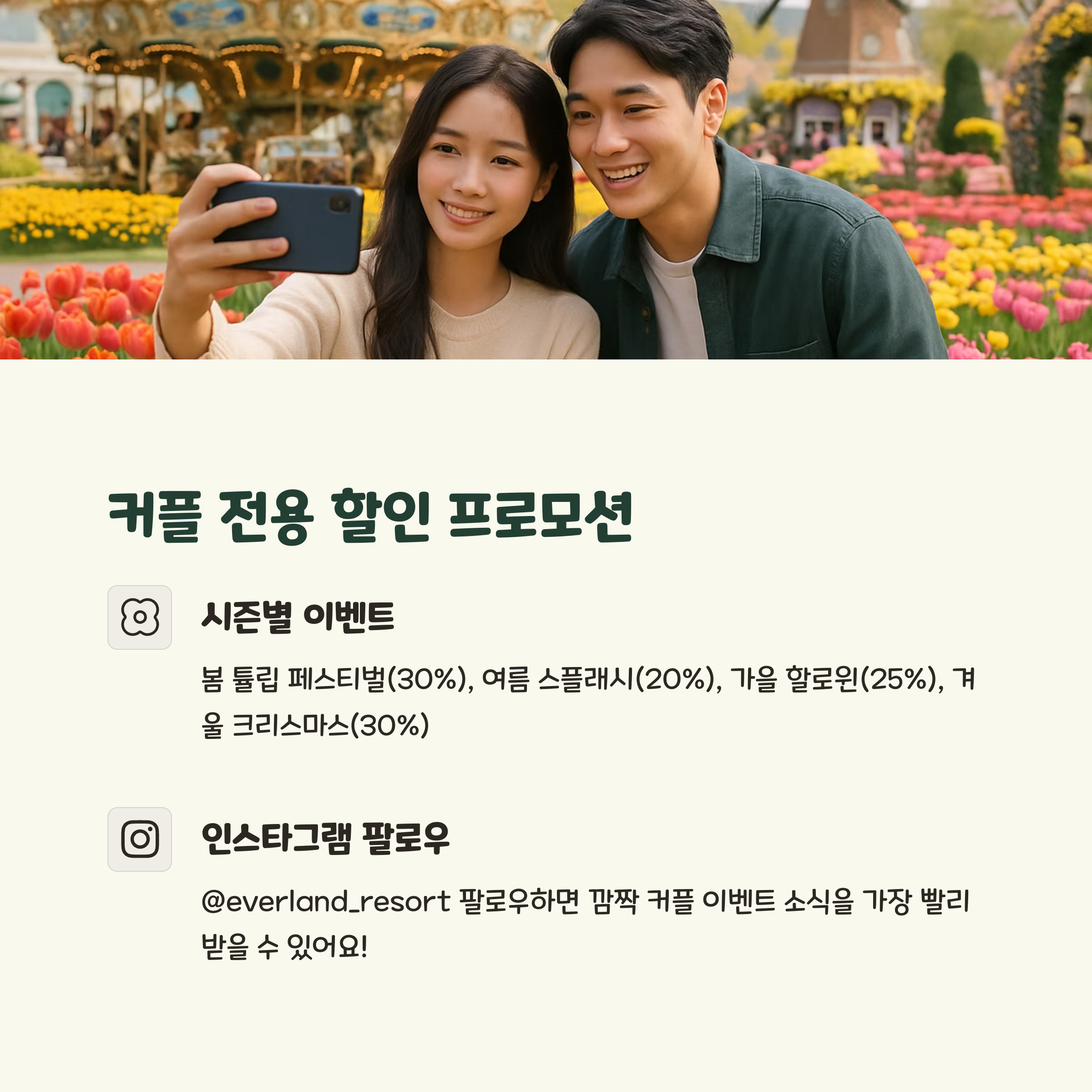 - 봄 시즌 (3~5월): 튤립 페스티벌 기간 중 커플 인증 시 최대 30% 할인