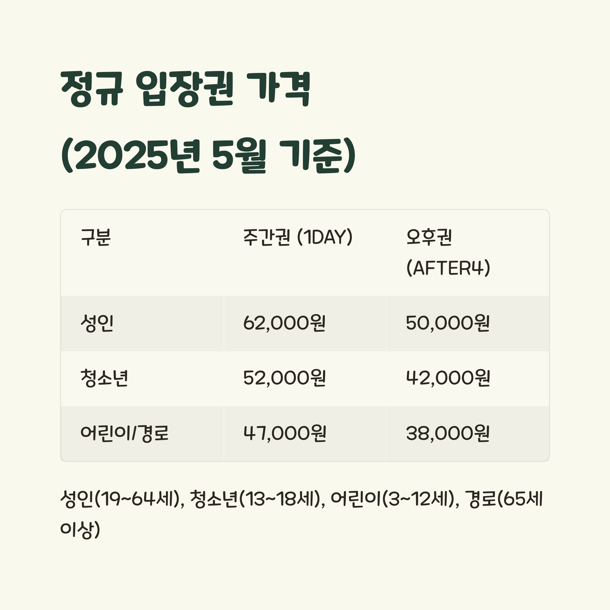 먼저 정규 가격을 알아야 얼마나 할인받을 수 있는지 계산할 수 있겠죠? 2025년 5월 기준 에버랜드 입장권 가격은 다음과 같습니다: