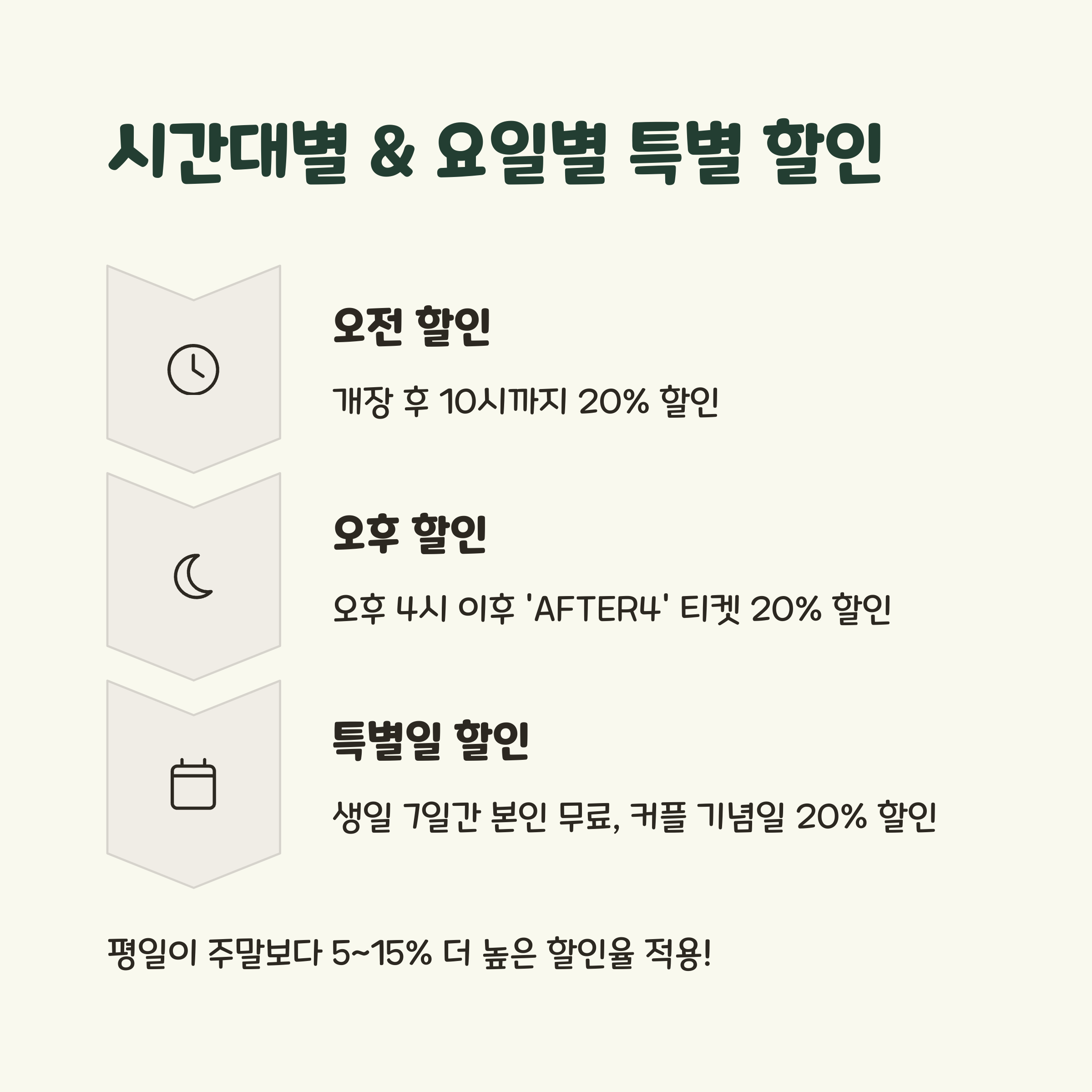 - 평일 할인: 월~금요일 방문 시 주말 대비 5~10% 추가 할인