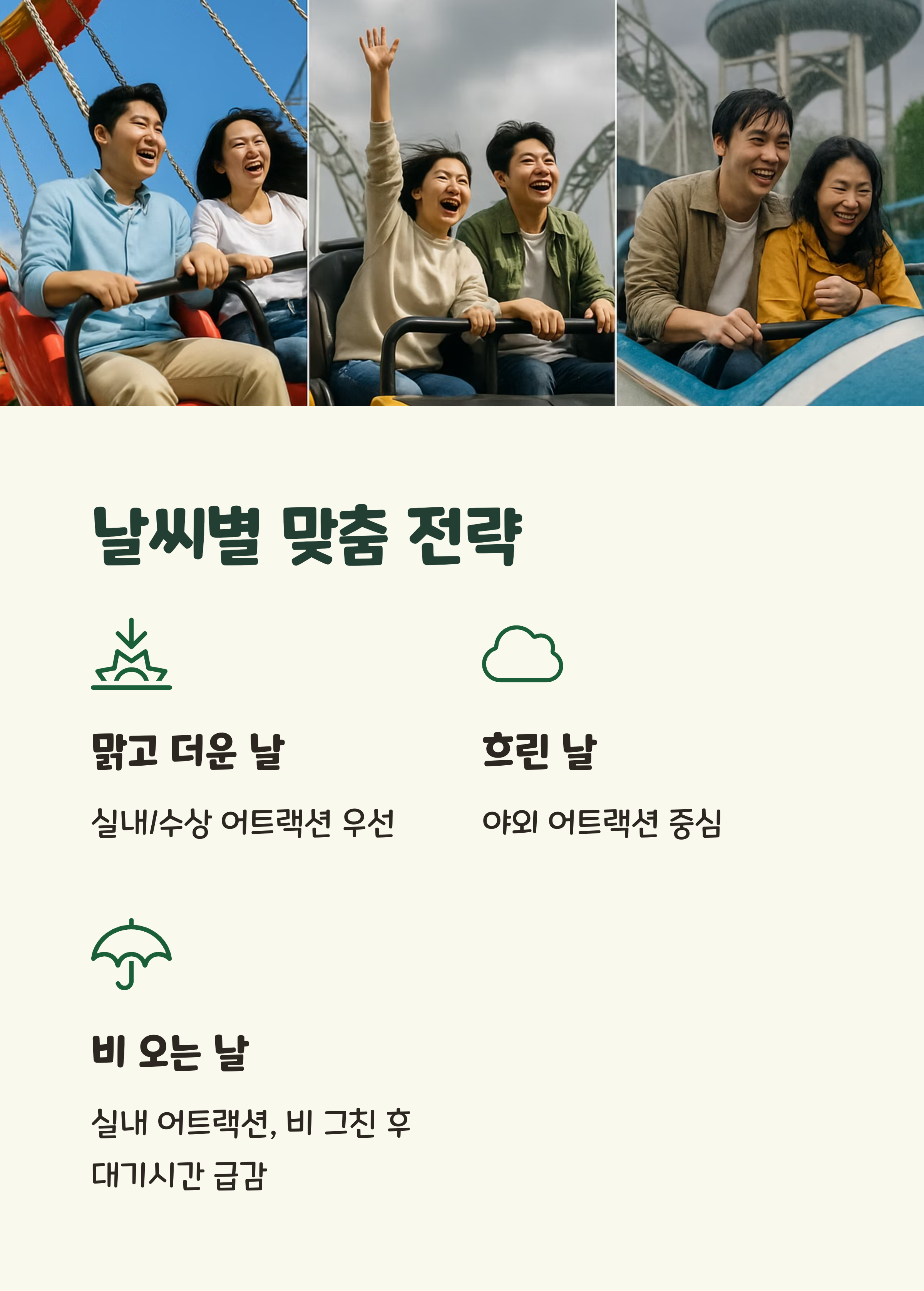 - 실내와 실외 어트랙션을 골고루 배치하여 날씨 변화에 대응하세요