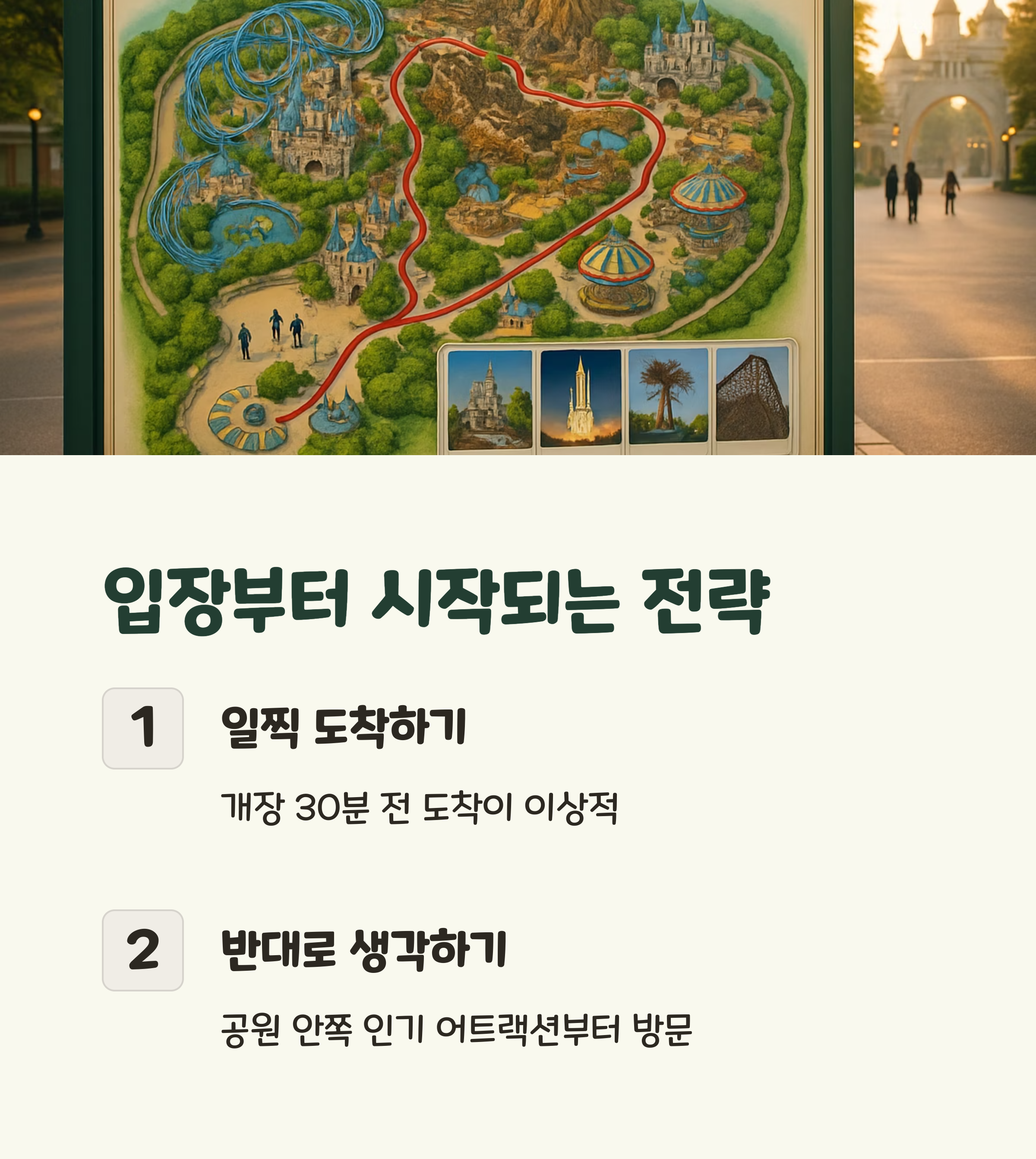 A: 일반적으로 공원 가장 안쪽에 있는 인기 어트랙션부터 시작해서 입구 쪽으로 이동하는 것이 효율적입니다. 대부분의 방문객들은 반대 방향으로 움직이기 때문에 이렇게 하면 대기 시간을 크게 줄일 수 있습니다.