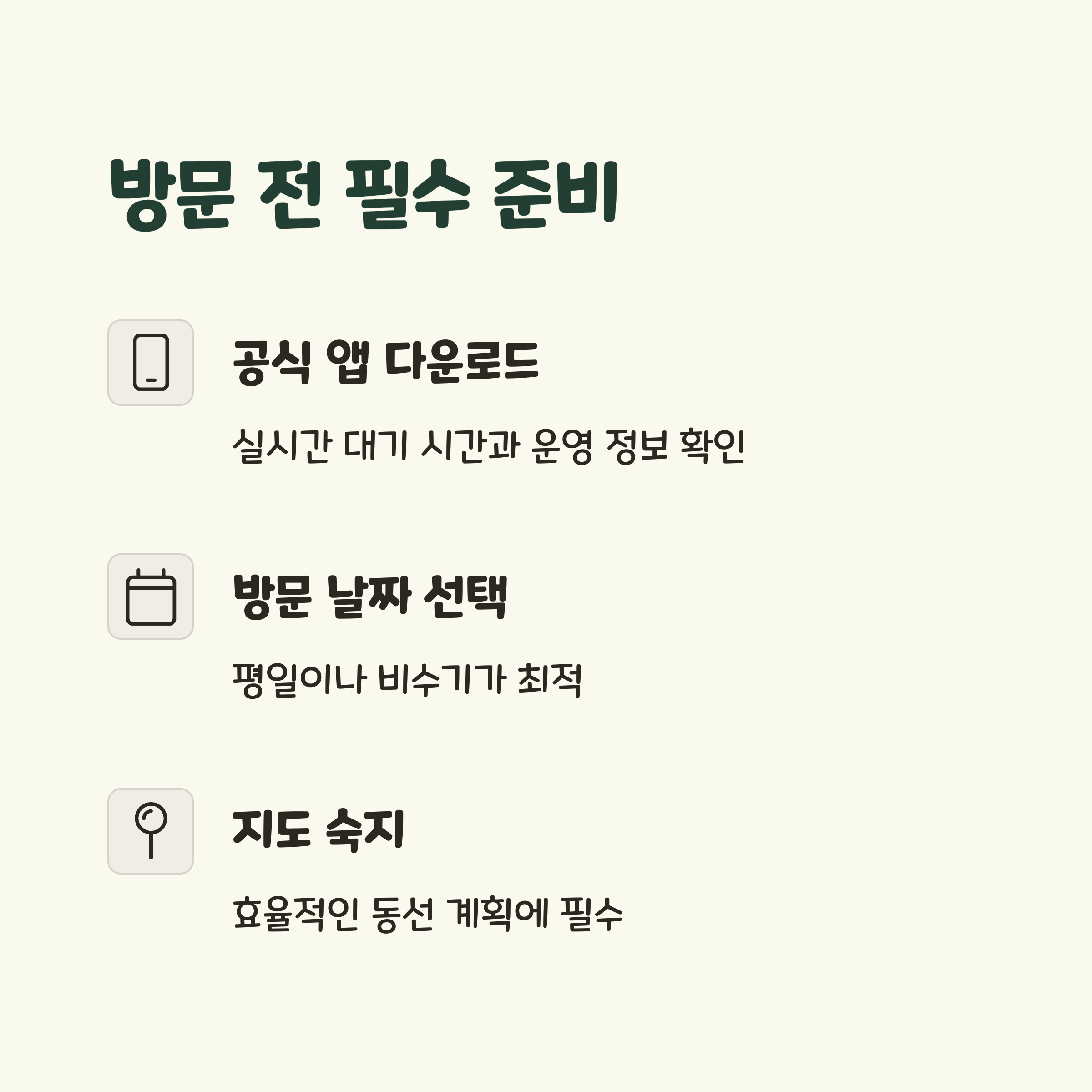 또한 방문 날짜를 선택할 때는 평일이나 비수기를 노리는 것이 좋습니다. 주말이나 공휴일, 방학 기간은 항상 붐비기 마련이니까요! 날씨 예보도 꼭 확인하세요. 가벼운 비가 내리는 날은 오히려 방문객이 적어 좋은 기회가 될 수 있답니다! ☔