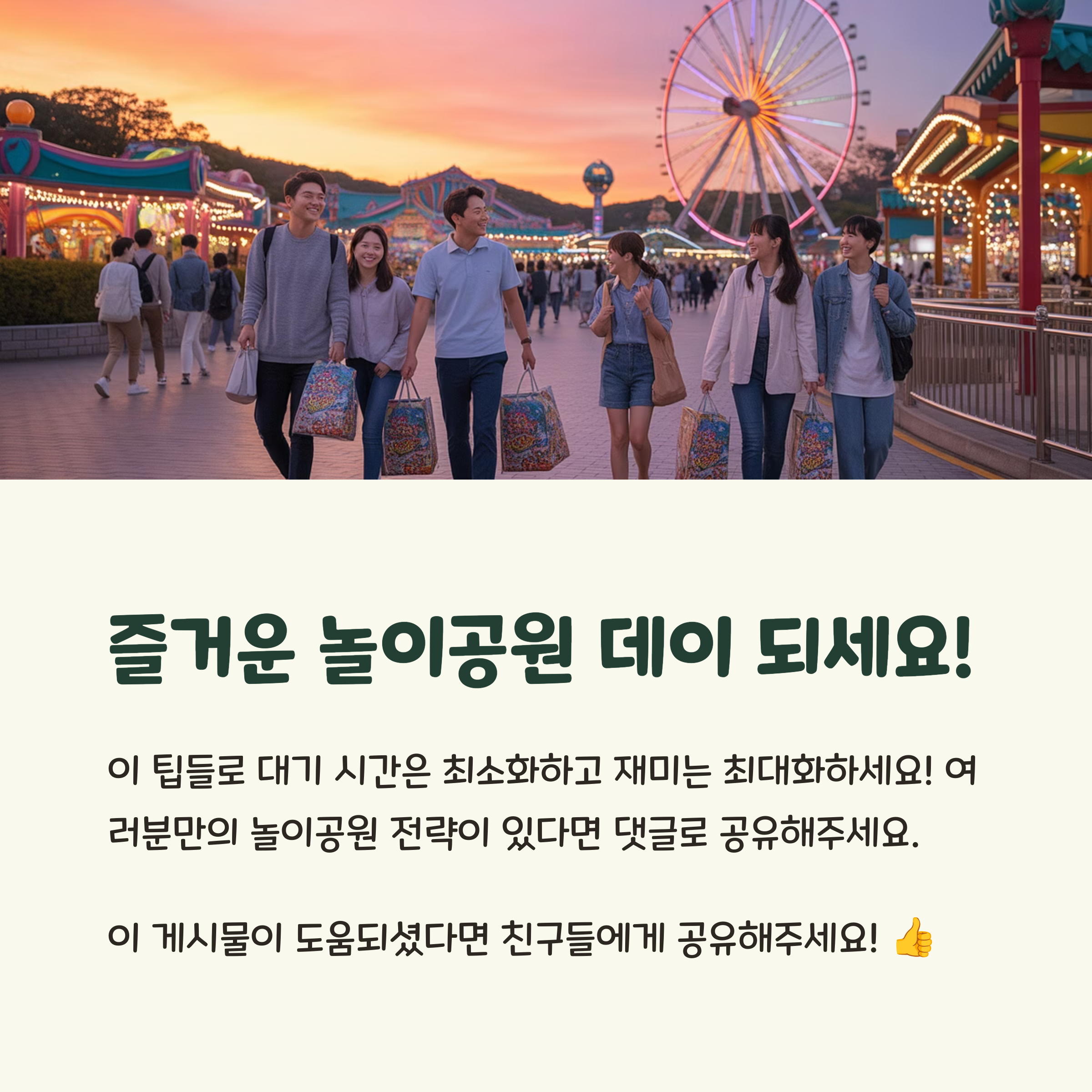 놀이공원에서의 하루는 정말 신나고 특별한 경험이 될 수 있습니다. 이 글에서 소개한 전략적 루트와 팁들을 활용하여 대기 시간은 최소화하고 재미는 최대화하세요! 여러분만의 완벽한 놀이공원 하루를 계획하는 데 이 가이드가 도움이 되길 바랍니다. 🎡🎢🎠