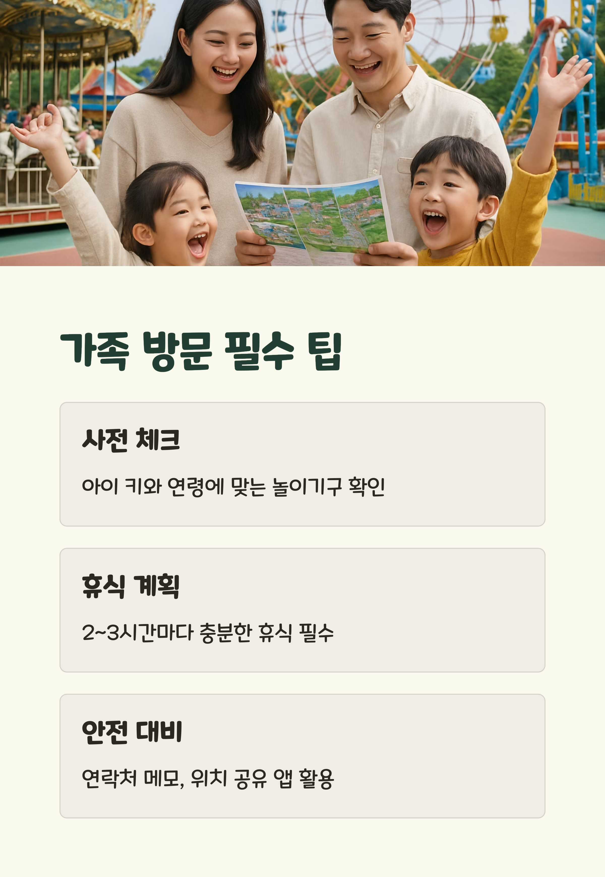 - 놀이공원 내 유아 휴게실이나 수유실 위치를 미리 파악해두세요